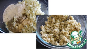 • Смешиваем приготовленную чечевицу, цветную капусту, специи (лук, чеснок, кумин, кайен, соль), оливковое масло и фасолевую муку.