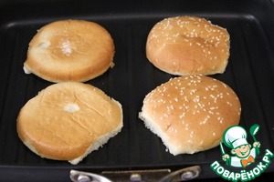 Теперь собираем бургер. Хлеб немного подсушиваем на сковороде
