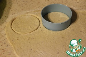 Подошедшее тесто раскатать в пласт толщиной 3-4 мм, вырезать формочкой кружочки.