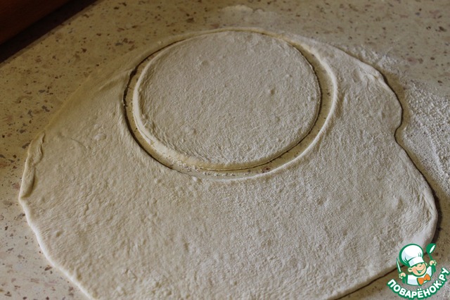 Тесто тонко раскатать. Блюдцем вырезать лепешку.