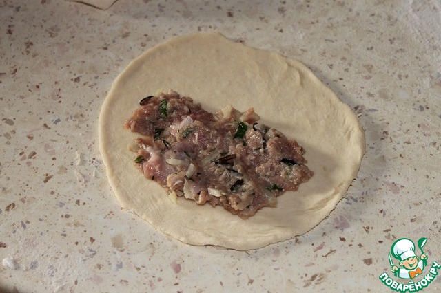 Положить начинку на одну сторону, накрыть второй половинкой теста и хорошо защипать края.