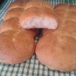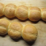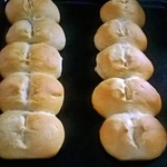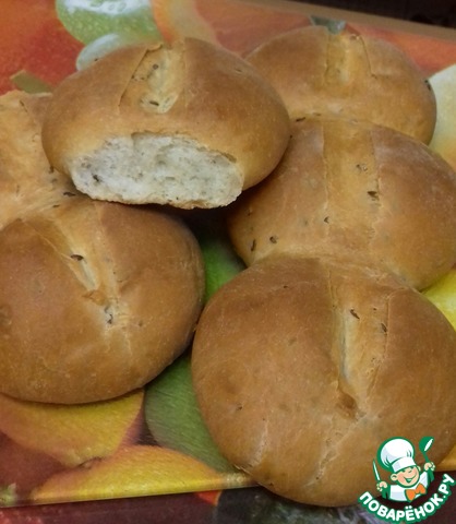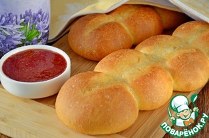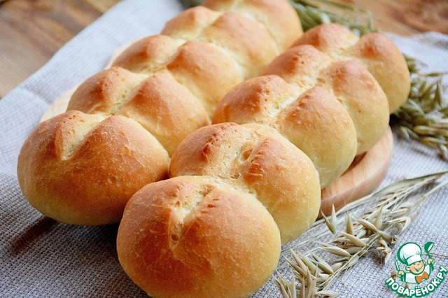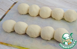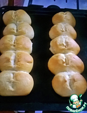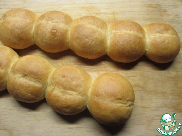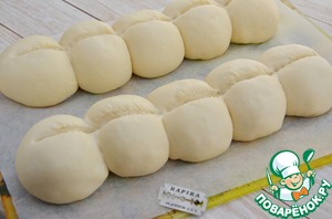 Тесто обмять, разделить на 10 кусочков, сформовать булочки, выложить их на доску застеленную пекарской бумагой близко друг у другу (по 5 шт), накрыть пищевой пленкой смазанной слегка растительным маслом и оставить на расстойку около 1 часа