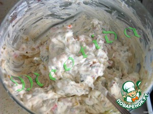 Смешать крем-сыр, измельченный укроп, мелкими кубиками нарезанный перчик и кукурузку.