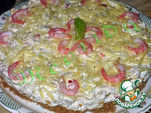 Убрать тортик на пару часов в холодильник, после чего вынуть из формы, поставить на сервировочное блюдо, посыпать тертым Российским сыром и украсить креветками.