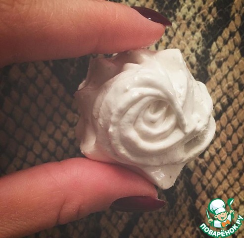 Еще теплую зефирную массу быстро выложить в кондитерский мешок с крупной насадкой и отсадить на заранее приготовленные противни застеленные пергаментом. Смазывать ни чем не нужно, оставить подсыхать, затем посыпать сахарной пудрой, склеить.
