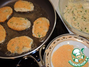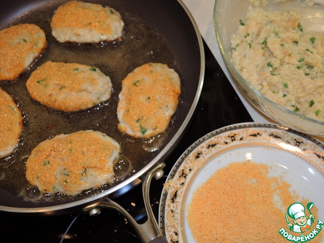Из фарша сформировать небольшие котлеты, при желании запанировать их в сухарях и обжарить на сковороде на растительном масле с обеих сторон по 4-5 минут, до румяной корочки. Выложить на бумажные полотенца и сохранять теплыми.