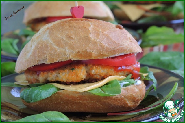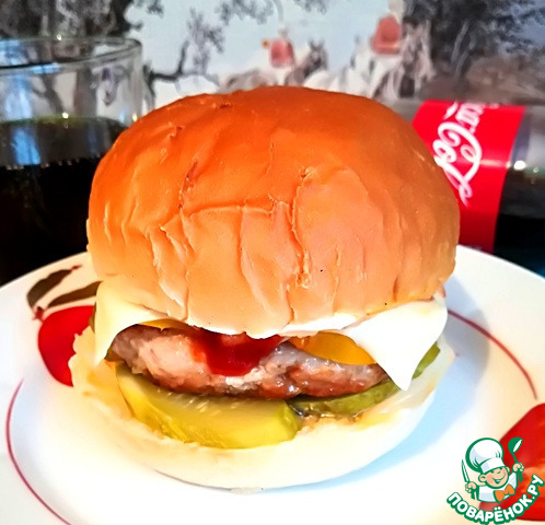 Свежие хрустящие булочки разрезать вдоль пополам. На нижнюю часть положить листья салата, ломтик плавленного сыра, котлету, немного кетчупа и два тонких кружка помидора. Накрыть верхней частью булочки и подавать.