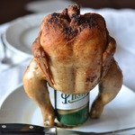 Посадить курицу на банку с пивом и поставить в тяжелое устойчивое блюдо (форму) с высокими бортиками. Поставить запекаться в разогретую до 190°С духовку на 80-90 минут (зависит от размера курицы). Бывает, что советуют прикрывать верх курицы листом фольги в процессе запекания, чтобы не пригорала. Но, у меня никогда не пригорает верх, возможно, это зависит от духовки. В любом случае, следите за своей курицей, и, в случае необходимости, прикройте верхнюю часть фольгой. В целом, готовая курочка получается хорошего «загорелого» цвета!