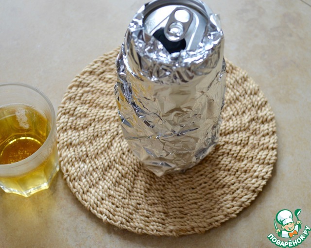 Банку с пивом вымыть. Отлить из неё ровно половину пива (использовать по усмотрению). Завернуть банку в пищевую фольгу.