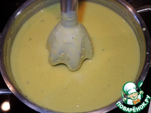 Влить горячие сливки и пробить всё погружным блендером до однородности. Довести до кипения и отставить. Консистенцию супа можно регулировать добавлением воды или сливок на своё усмотрение.