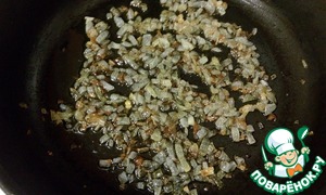 Лук режем кубиками и обжариваем на подсолнечном масле до золотистости. Оставляем остывать.