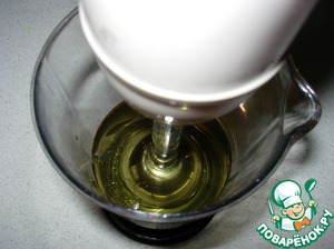 Когда на дне чаши начинает образовываться майонез, понемногу поднимаем и опускаем блендер, пока на поверхности не останется масла.