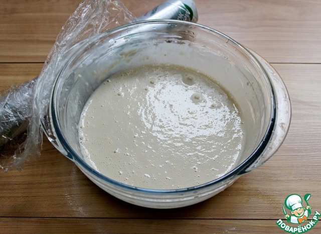 Накрыть миску с опарой плёнкой и убрать в тёплое место на минут 15, чтобы поднялась «шапочка». Я всегда ставлю в духовку при 50°С.