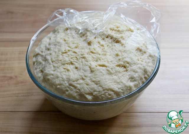 Должно получиться эластичное и мягкое тесто. Выложить его в миску, накрыть плёнкой и убрать в тепло (в моём случае, духовка) не менее, чем на 1 час.