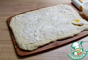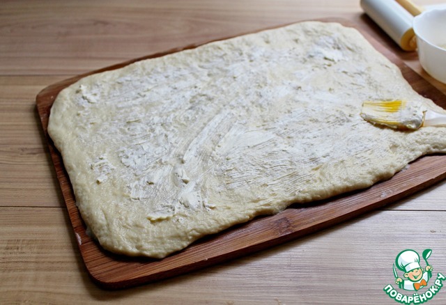 Тесто раскатать в прямоугольный пласт. Смазываем мягким сливочным маслом.