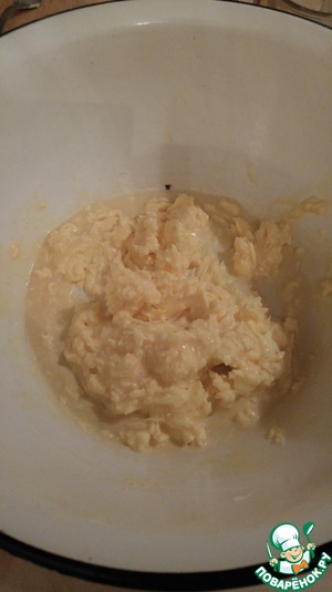 Готовим крем для обмазки. В миске смешиваем теплое масло со сгущенным молоком, взбиваем. Фото начальная стадия смешивания ))