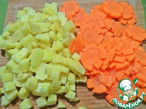 Морковь, картофель помыть, очистить. Картофель нарезать мелкими кубиками. На моркови сделать насечки и нарезать цветочками.