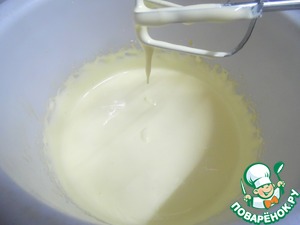 Очень аккуратно, чтобы не осели белки, перемешивать лопаткой, постепенно добавляя растопленное сливочное масло. Должна получиться очень воздушная масса. -