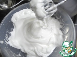 В отдельной чаше взбить белки до стойких пиков, всыпать оставшийся сахар (75 г) и взбивать еще 3-5 минут.
