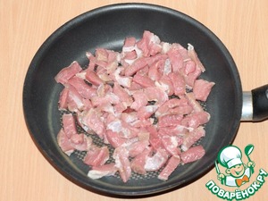 1. Мясо моем, сушим бумажным полотенцем и нарезаем порционными кусочками. Разогреваем растительное масло в сковороде и обжариваем мясо до румяности на сильном огне.