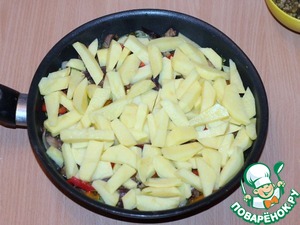6. очищенный от шкурки и порезанный картофель, солим и перчим. Периодически перемешиваем и готовим до готовности мяса и картофеля.