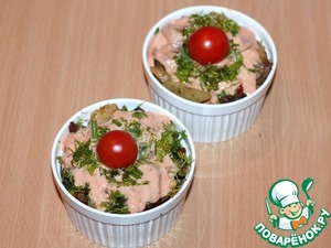 8. Выкладываем приготовленное мясо с овощами в формочки для запекания. В каждую формочку добавляем по 2 ст. л. соуса, посыпаем зеленью. Сверху кладем по 1 помидорке черри.