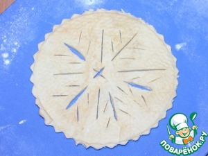 9. Раскатываем слоеное тесто на припыленной мукой доске и вырезаем 4 круга, диаметр которых должен быть на 2 см больше диаметра формочки. На круге можно вырезать треугольнички или снежинки.