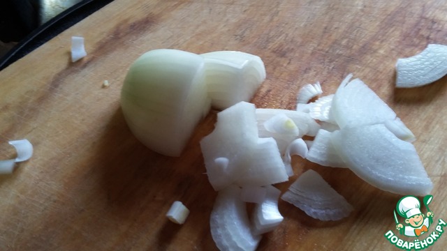 Пока лук тушиться, подготовить курицу - вымыть, разделать на порционные куски, мельчить не нужно