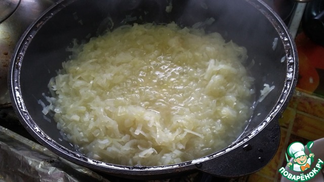 Весь лук высыпать в казан, добавить воды и поставить на огонь