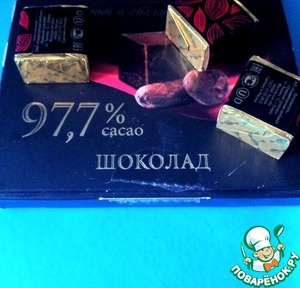 В оригинальном рецепте предлагается использовать шоколад с содержанием какао не менее 90%. У меня всегда есть вот такой шоколад 97.7%. Есть его, конечно, не каждый сможет, но в кулинарии он очень даже неплох.
