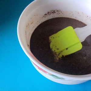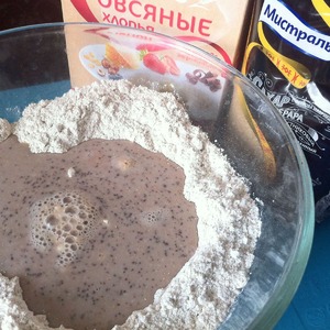 Сделать в мучной смеси колодец и вылить в него теплую воду и шоколадно-молочную смесь.