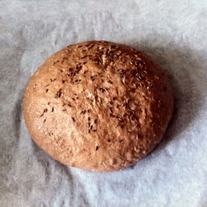 Сформируйте на противне буханочку, накройте ее и оставьте еще на 30 минут. Затем смочите поверхность водой, посыпьте тмином и отправьте в духовку, разогретую до 180 градусов. На нижний уровень духовки поставьте емкость с водой, пар способствует образованию аппетитной корочки.
