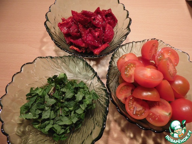 Черри нарезать половинками, томаты – небольшими кусочками, мяту нашинковать.