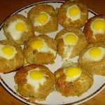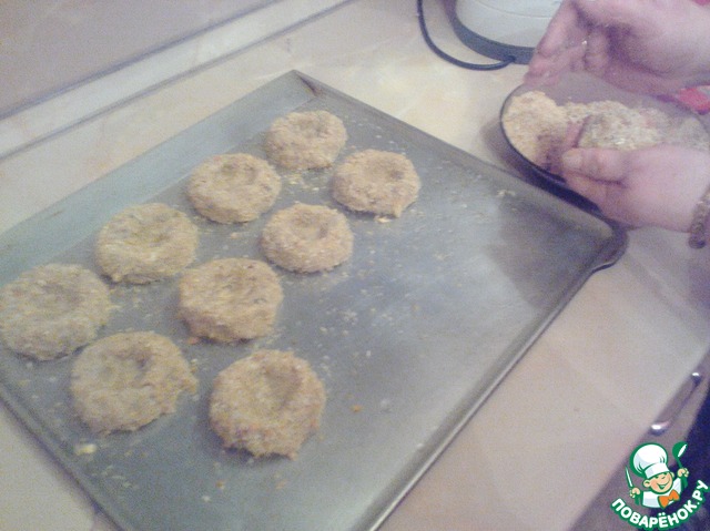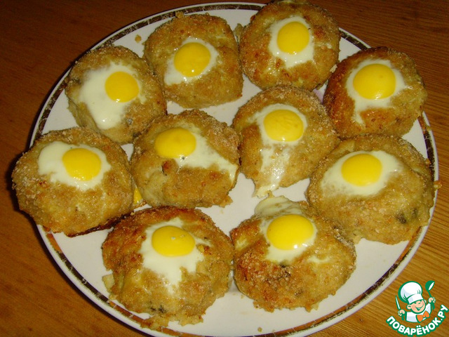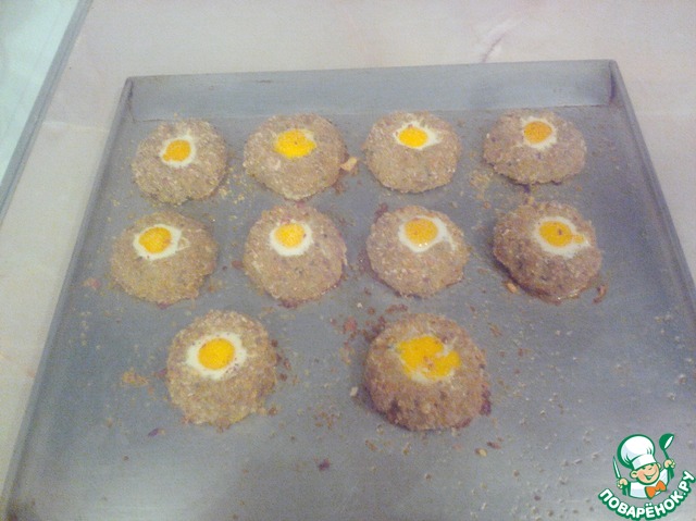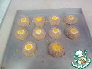Сделать биточки, обвалять в сухарях, разложить на противень, смазаный маслом. Сделать в биточках углубление для перепелиного яйца. Отправить в разогретую духовку (200 градусов).