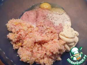 В фарш добавить подготовленные продукты, яйцо, майонез, посолить, поперчить, хорошо вымесить.