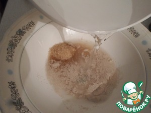 Дрожжи с сахаром заливаем водой, ждем, пока растворятся.