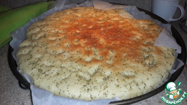 На покрытие взяла, как и Вы, прованские травы, а свежий чеснок заменила на сухой (он не такой при выпечке "пахучий"). Присыпала крупной морской солью. Пекла на конвекции 180 С, на большом "родном" духовочном противене.