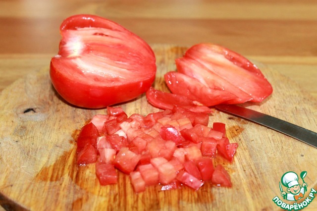 Томат разрезать, удалить семена и нарезать мелким кубиком.
