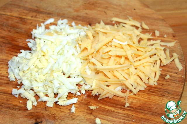 Яйца сварить вкрутую, очистить, натереть на крупной тёрке.