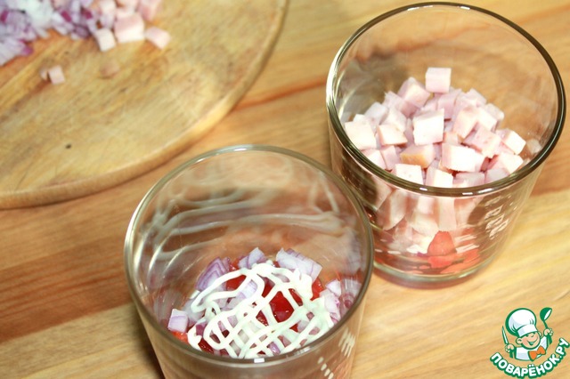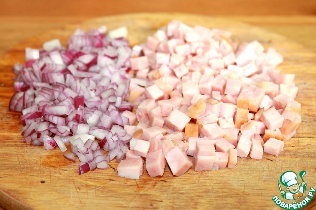 Мелкую луковицу и копчёную ветчину так же мелко нарезать.