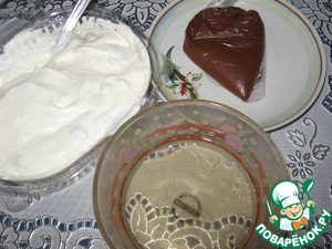 Подготовить сироп - смешать воду с сахаром и коньяком. Шоколад поломать и растопить, сметану перемешать с творожной массой.