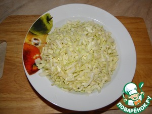 Как можно мельче нарезать капусту ( 2 стакана), чуть посолить и помять руками, чтобы она дала немного сока.