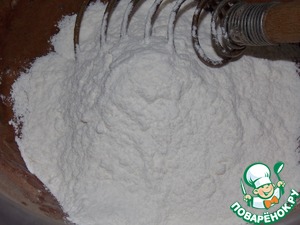 Добавить гречневую муку, разрыхлитель и какао-порошок.