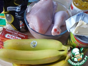 Вот и все. Осталось только собрать блюдо. Его желательно подавать в глубокой посуде, так как рис щедро поливается соусом. Итак, выложить рис, полить соусом, выложить курицу на рис вместе с бананами и ананасами. Можно посыпать черным перцем.