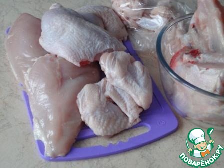 Курицу в оригинальном рецепте рекомендуют жарить целиком в духовке. Я жарю частями и на сковороде. При этом разделываю курицу, вырезая спинку и грудинную кость. Эти части идут на бульон.