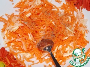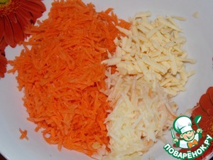 Морковь натереть на тёрке, половину яблока очистить и натереть на тёрке (это наш нежный секрет) и сыр натереть на тёрке (1 ст. л.).
