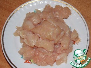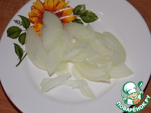 В сковороду налить 2ст. л. растительного масла, обжарить лук до слегка золотистого цвета, затем добавить филе. Жарить 5 минут.