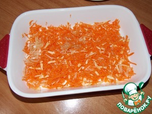 Форму для запекания смазать маслом. Выложить морковь с яблоком и сыром.
