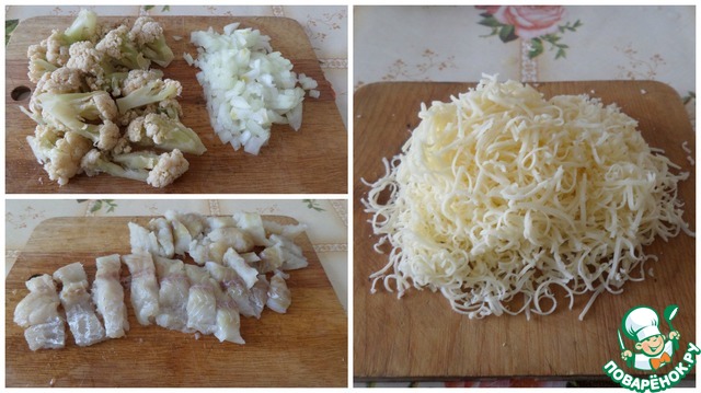 Нарезаем лук, рыбное филе и цветную капусту. (Я использовала замороженную цветную капусту). Сыр трем на терке.