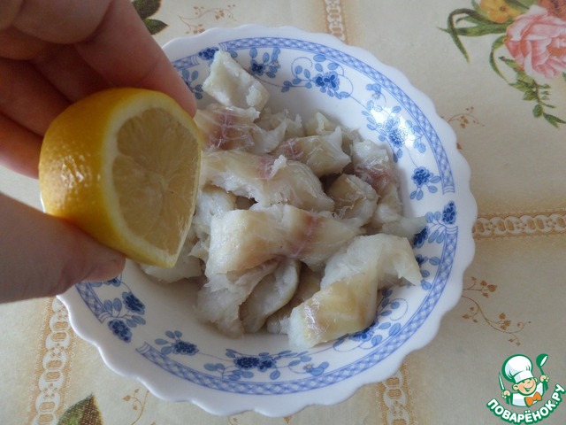 • Нарезанное рыбное филе кладем в чашку и добавляем сок половины лимона и щепотку соли. Перемешиваем. Оставляем на 10-15 минут.